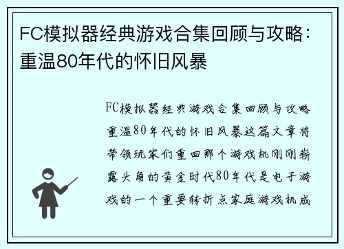 FC模拟器经典游戏合集回顾与攻略:重温80年代的怀旧风暴,这篇文章将带领玩家们重回那个游戏机刚刚崭露头角的黄金时代。80年代是电子游戏的一个重要转折点,家庭游戏机成为了娱乐的重要形式,而FC(Famicom)模拟器的经典游戏合集,则让我们得以在现代设备上重温那段属于红白机的岁月。文章将从四个主要方面入手:经典游戏的回顾、游戏类型的演变、操作技巧与攻略、怀旧情感的寄托。这些方面不仅展示了FC模拟器经典游戏的独特魅力,也让我们能更好地理解那个时代电子游戏给人们带来的影响与乐趣。通过本文的回顾与攻略,玩家们不仅可以在游戏中找到挑战,还能感受到一段永远无法褪色的游戏历史。